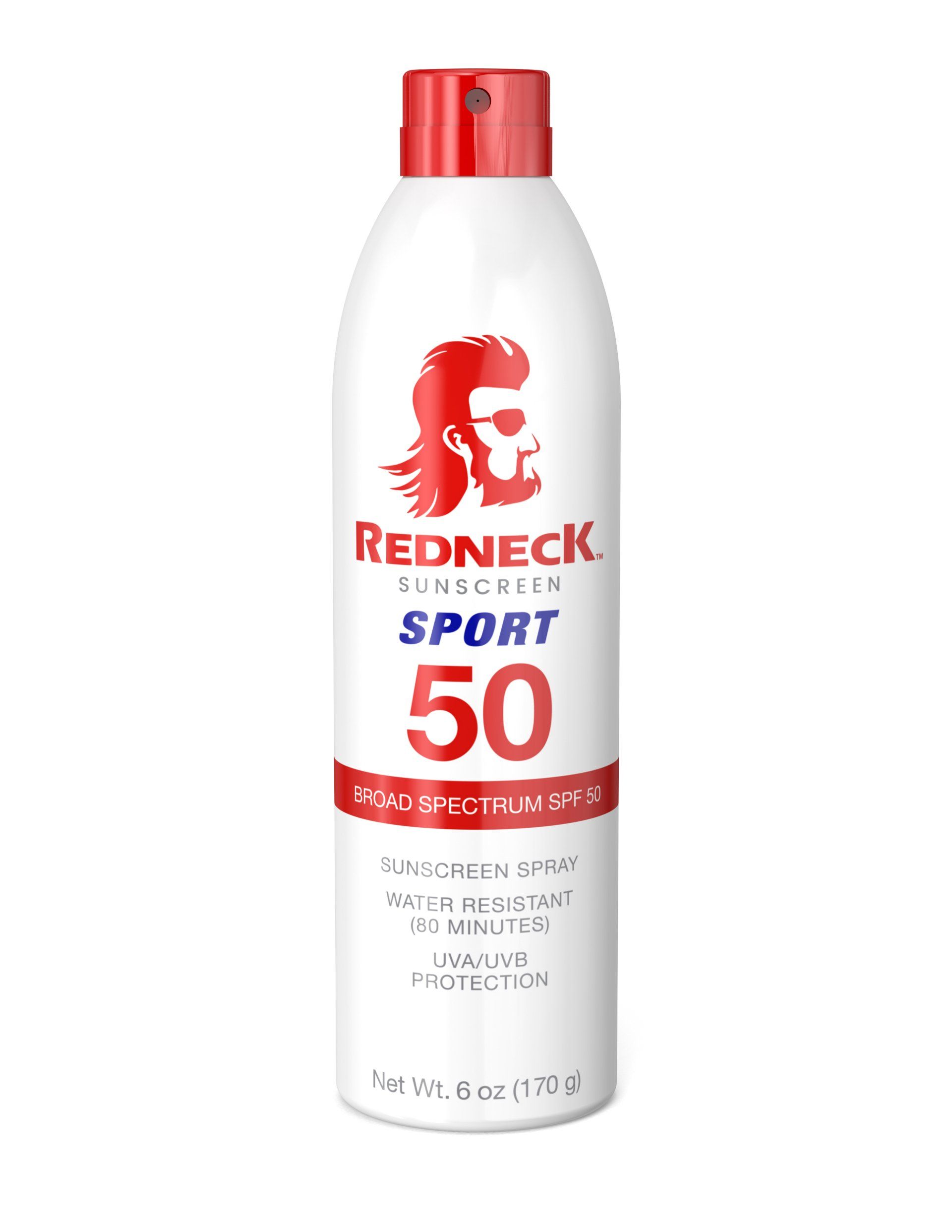 Introducing Redneck Sunscreen SPF 50 Sport Spray. This broad spectrum sunscreen was designed by the science folks to give you protection against burning UVB and aging UVA rays. It's cool to be a Redneck but it's not cool to have a red neck. Redneck Sunscreen is sweat and water resistant for up to 80 minutes. Your Mullet is Not Enough.